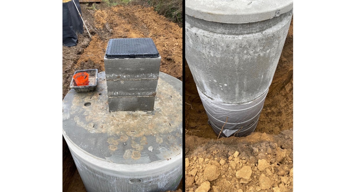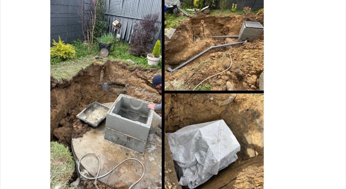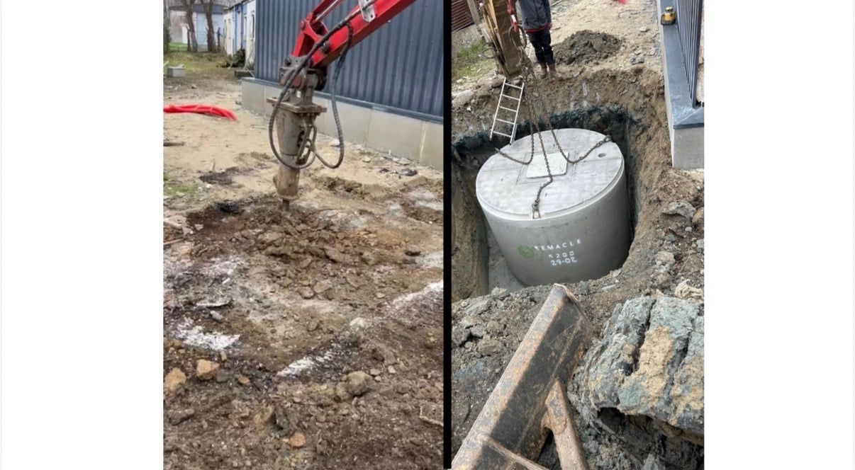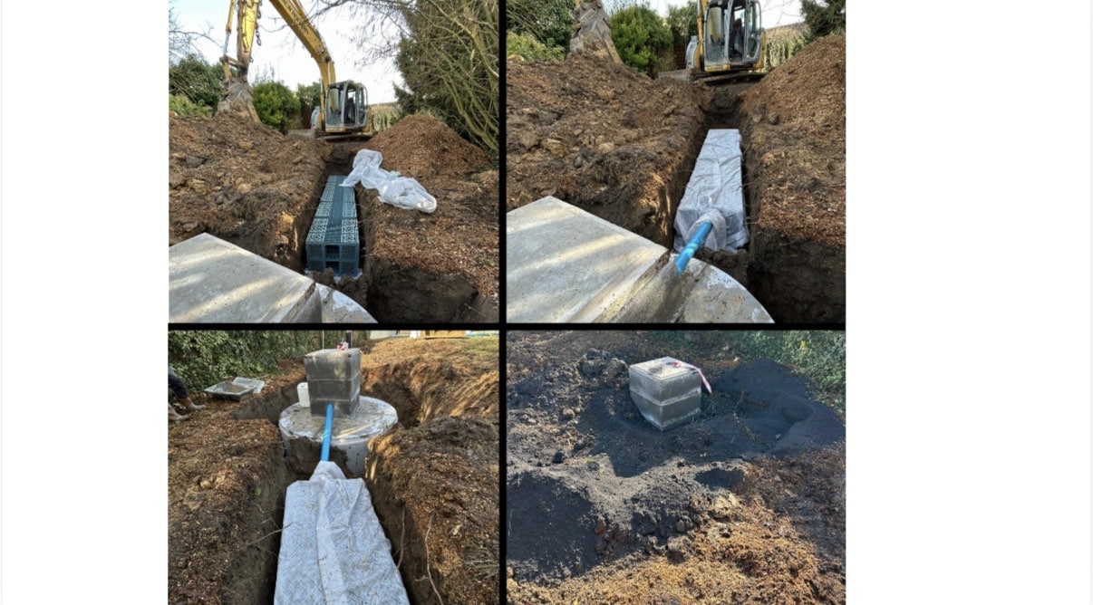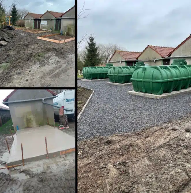 Dans un premier temps, notre équipe a réalisé le terrassement afin de préparer l’emplacement destiné à accueillir la cuve. Celle-ci a ensuite été mise en place, suivie