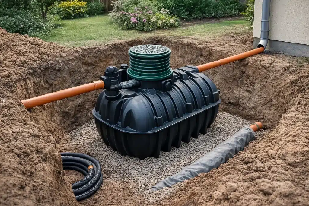 Enterrée sous le niveau du sol, la cuve ne gêne pas l’aménagement extérieur et reste protégée des variations de température et des chocs.